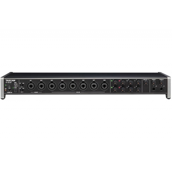 Continuando la sua tradizione e la passione per l'audio, l'US-20x20 "Celesonic" è il fiore all'occhiello della linea di interfacce Tascam. Progettato per l'uso in strutture di registrazione professionali o Project Studio, questa interfaccia audio supporta 192kHz e utilizza USB 3.0, uno standard di trasmissione all'avanguardia. Con funzionalità aggiuntive, come le modalità Mic Preamp e Mixer, diventa uno strumento molto versatile - oltre ad essere una interfaccia per la registrazione multi-canale. I preamplificatori microfonici sono cruciali per la massima qualità audio. Gli otto preamplificatori microfonici Tascam Ultra-HDDA hanno un rumore di ingresso equivalente di -125dB (EIN). Inoltre 20dB di headroom sugli ingressi microfonici e di linea permettono di gestire facilmente alti transitori SPL causati da percussioni e strumenti. Utilizzando un processore Blackfin ad alte prestazioni, l'US-20x20 offre un mixer DSP avanzato, compresi EQ, compressione e riverbero per ogni canale. Il processore eccelle non solo sulla dinamica e gli effetti, ma consente la trasmissione multicanale tramite USB3.0 per lo studio. Ulteriori caratteristiche significative permettono un flusso di lavoro senza soluzione di continuità del tecnico professionista. La modalità switching fornisce la possibilità di utilizzo dell'US-20x20 come preamplificatore microfonico indipendente, interfaccia audio, o come un mixer per applicazioni di amplificazione sonora. Una completa connettività a vari tipi di apparecchiature audio si ottiene utilizzando gli ingressi e le uscite analogiche, ingressi e uscite digitale tramite connettori coassiali e ottici, connettori MIDI e word clock BNC. Lo stile accattivante ed il design industriale angolato dell'US-20x20 rendono la registrazione desktop un gioco da ragazzi. E' incluso anche un adattatore per il montaggio a rack.